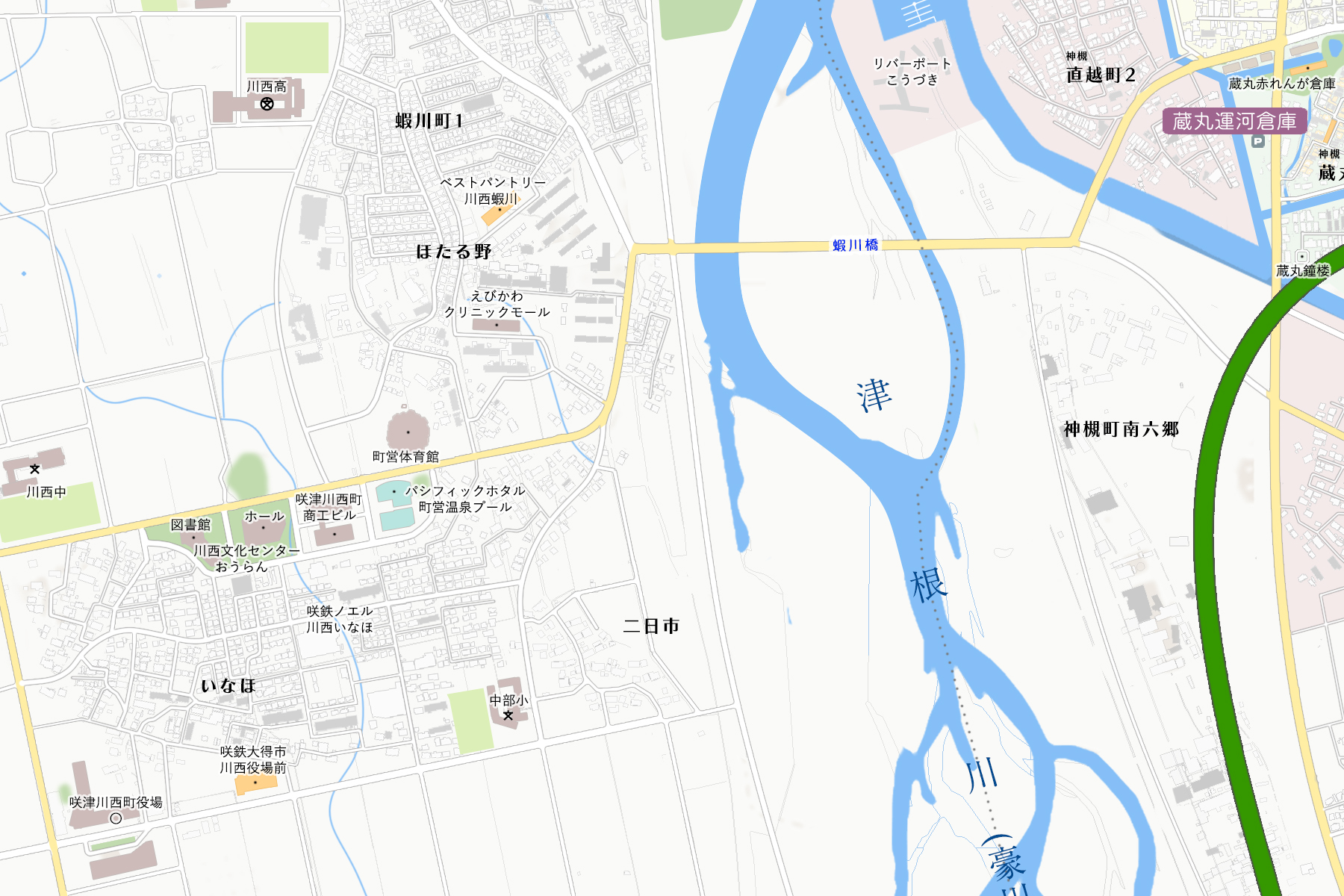 津根川(豪川)を挟んで対岸に位置する北咲津郡咲津川西町。…咲津世界では「合併」していない。空港立地自治体である事、および第一次産業による歳入等から財政状態も良好なので、合併によるメリットは希薄であると考えられる。町の公共施設ゾーンおよび旧来の中心集落と一体化したニュータウン「咲鉄ノエル川西いなほ」は(株)さきてつ不動産の最高傑作と呼び声高い。
