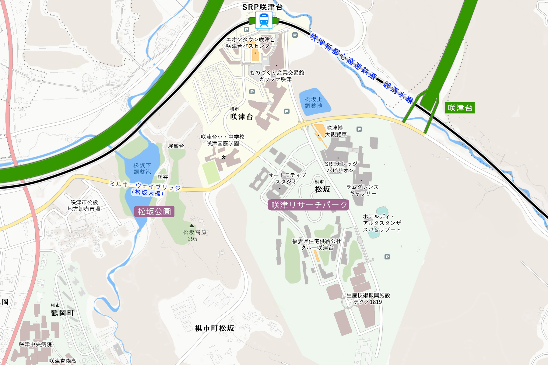 市域北東端に拡がる岩塊部を削って造成した土地。咲津世界では住宅地メインの団地ではなく、ものづくり生産技術の振興に特化した研究都市「咲津リサーチパーク」となっている。「分水嶺で言えば金森川」というとんでもない場所を開発してしまったので、それを活かして「天ぷらまんじゅうの磐清水地区」まで迂回無しのショートカット鉄道路線を建設。非電化単線だが、建設中止となった「咲津新幹線」フル規格区間の設備を受け継いでいる為、高速走行を可能としている。