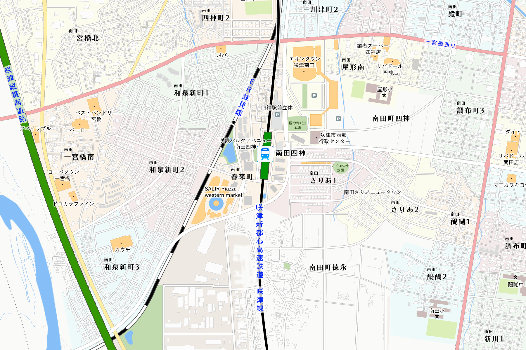 咲津市街地は拡大し続けており、特に南西部の伸びが著しい。都市計画上は重点的施策のある地域では無かったが、南田町四神・和泉新町で高まる住宅需要を受けて新駅「南田四神駅」の開業させるとともに、同駅前地域を副次拠点(地区センター)として位置付け、一定の都市機能集積を図る運びとなった。